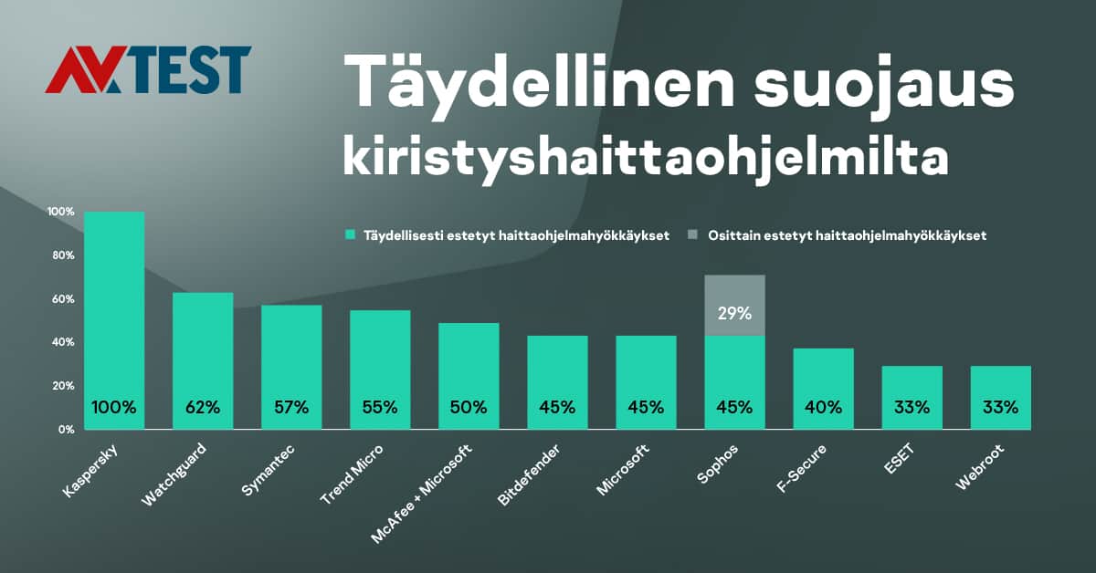 Kaspersky Endpoint Security Cloud suojasi sataprosenttisesti kiristyshaittaohjelmien hyökkäyksiltä AV-TESTin äskettäisen arvioinnin mukaan. Kolmen eri skenaarion ja 113 hyökkäyskoodin tuloksena tuote ei menettänyt yhtään käyttäjän tiedostoa ja oli parempi kuin 10 muuta kyberssuojausratkaisujen valmistajaa.