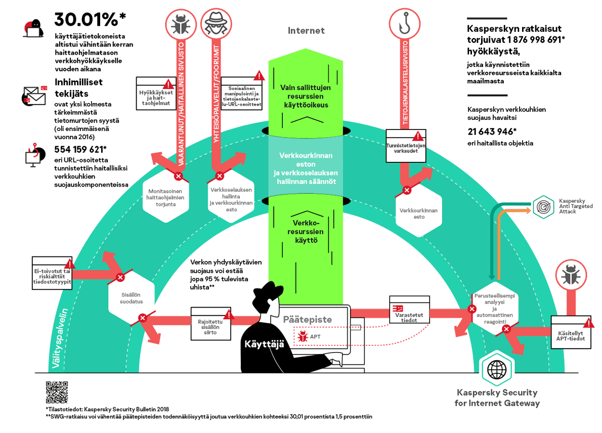 Kaspersky Security for Internet Gateway tarjoaa luotettavan suojauksen kaikenlaisilta verkkopohjaisilta uhilta, kuten haittaohjelmilta, kiristysohjelmilta, miner-ohjelmista ja tietojenkalastelulta – samalla, kun se vähentää riskejä ja lisää tuottavuutta hallitsemalla Internetin käyttöä.